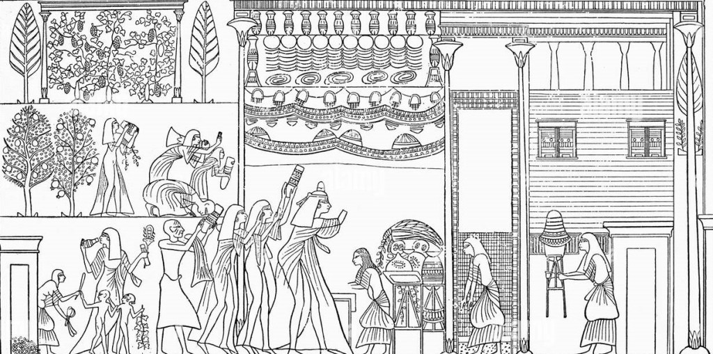 The typical Egyptian townhouse was a one storey compound, semi-covered and constructed of mudbrick walls on top of a stone foundation. Roofs/ceilings were formed by wooden beams and joists, squared, and supported by the exterior walls and central columns. The roof was finished with reed thatch and a thick layer of mud plaster. A wooden staircase or ladder inside the house compound would give access to the roof for additional, and more comfortable, living space. The interior was dark, lacking windows, but cooling in the hot climate. Perhaps there were clerestory openings allowed in at the top of the walls, below the roof framing. There was usually a common room in front with two smaller rooms at the back. Some rooms had no ceiling and so were essentially walled patios useful for cooking or sleeping. One must imagine woven mats, clay pottery, and linen canopies. In Egypt then, as now, people would spend much of their leisure time on the roof. One can further imagine that they might erect lightweight wooden frames on the roof, creating more private shaded space. This retreat could be open to the stars or shaded from the sun by colourful mats and fabrics.